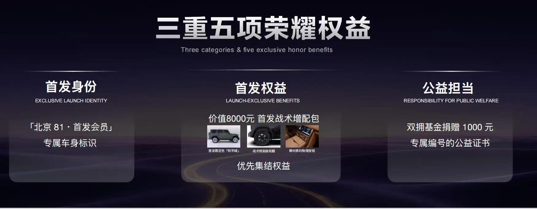 盲订且最终购车的用户,将获授「北京 81・首发会员」荣誉身份,并授予线上勋章和实体徽章。首发车型将在车身多处,镌刻首发车印记,打造专属身份标识。