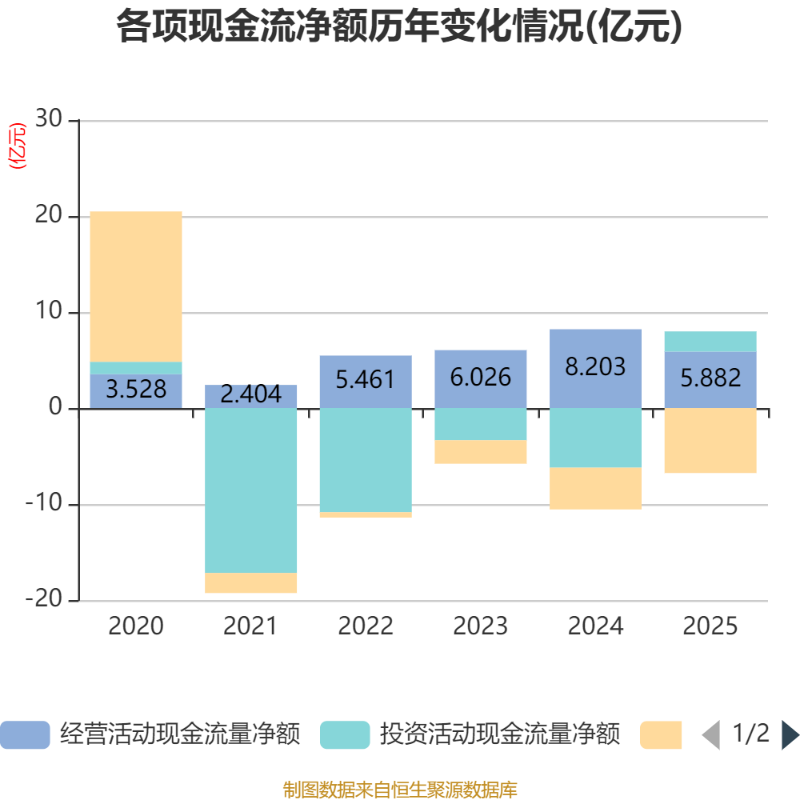 截至2025年,公司经营活动现金流净额为5.88亿元,同比下降28.3%;筹资活动现金流净额-6.77亿元,同比减少2.42亿元;投资活动现金流净额2.1亿元,上年同期为-6.22亿元。