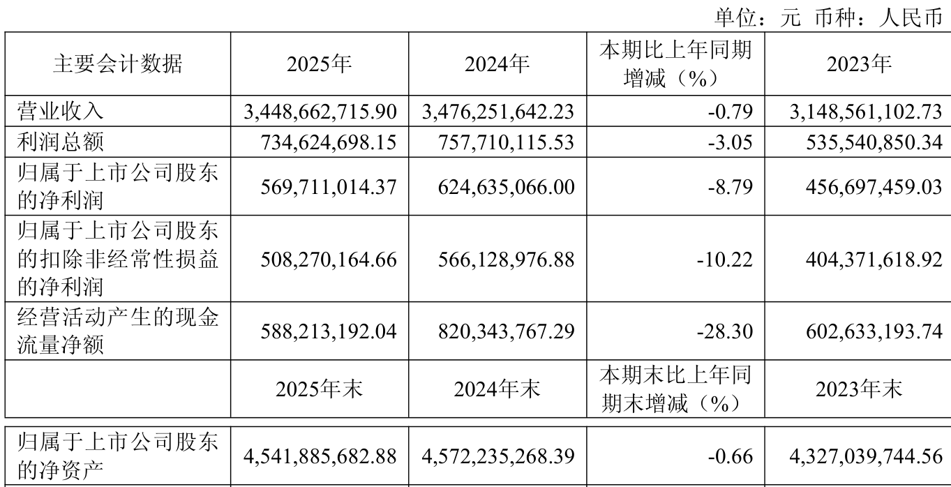 中证智能财讯天味食品(603317)3月12日披露2025年年度报告。2025年,公司实现营业总收入34.49亿元,同比下降0.79%;归母净利润5.7亿元,同比下降8.79%;扣非净利润5.08亿元,同比下降10.22%;经营活动产生的现金流量净额为5.88亿元,同比下降28.30%;报告期内,天味食品基本每股收益为0.5386元,加权平均净资产收益率为12.92%。公司2025年度分配预案为:拟向全体股东每10股派现5.5元(含税)。