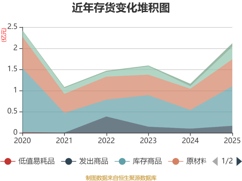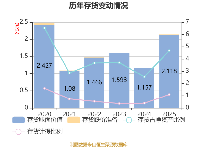 从存货变动来看,截至2025年末,公司存货账面价值为2.12亿元,占净资产的4.66%,较上年末增加9607.61万元。其中,存货跌价准备为231.86万元,计提比例为1.08%。